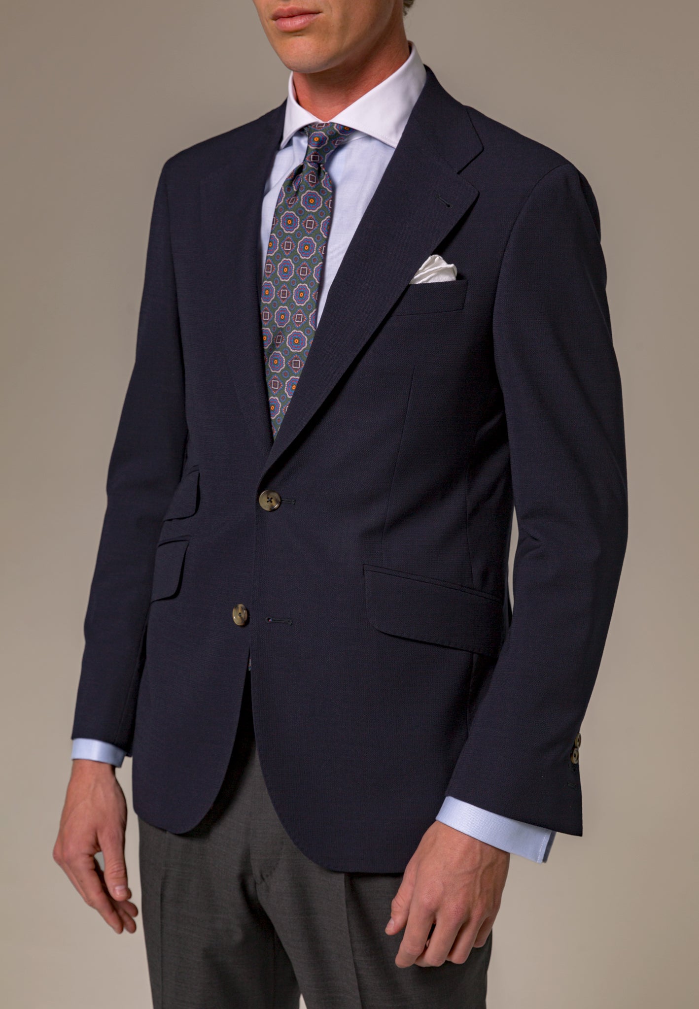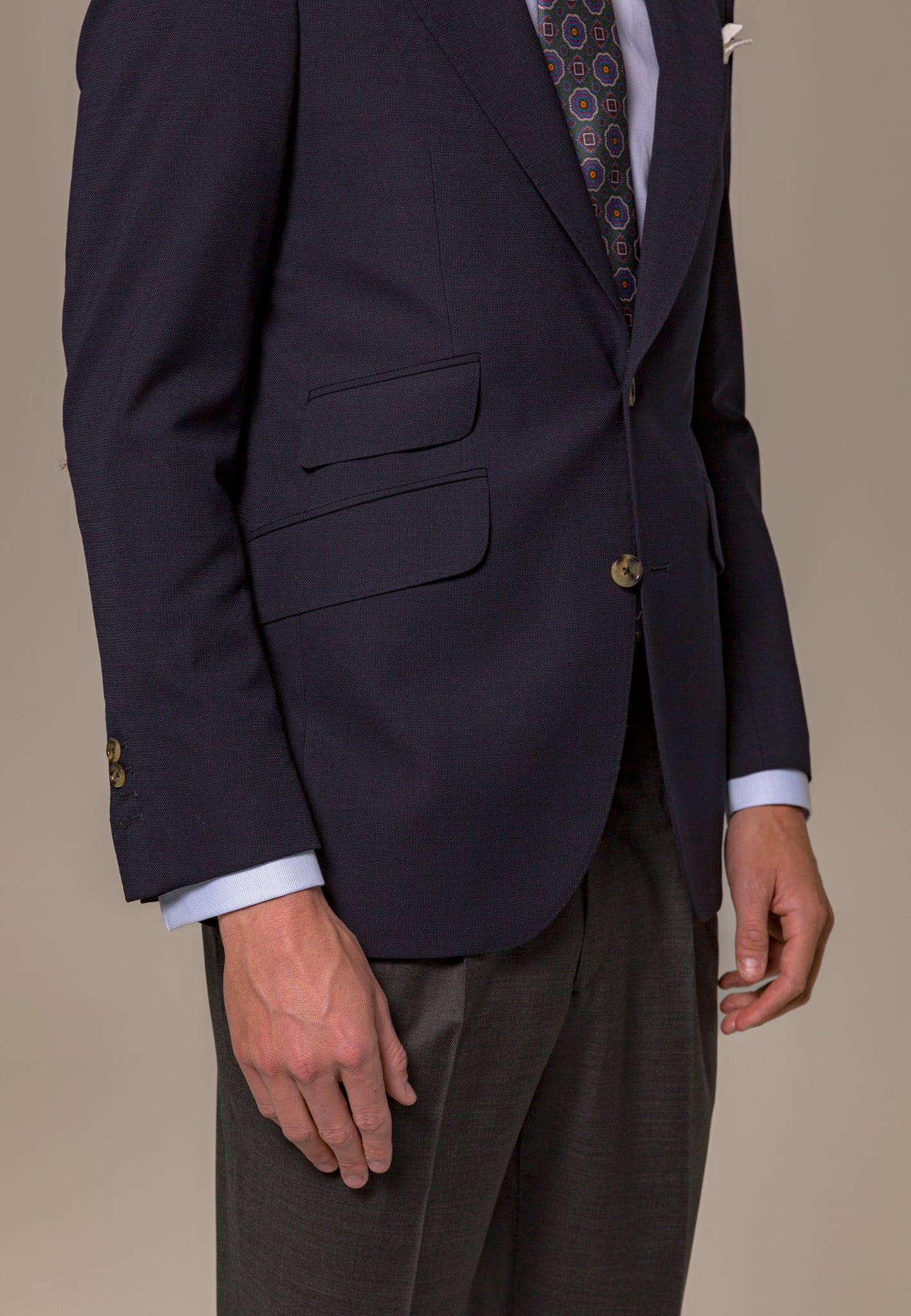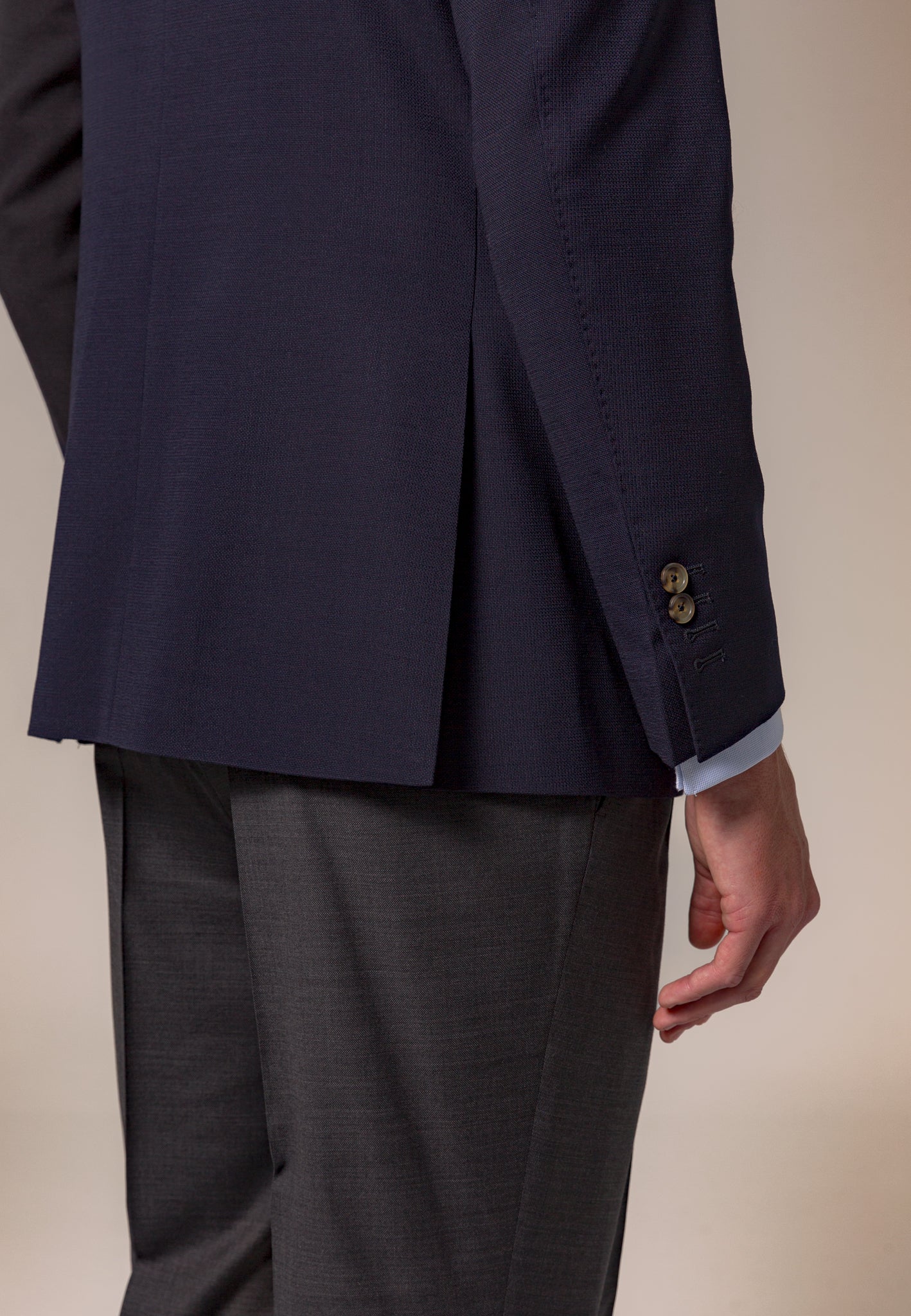 La Americana Azul confeccionada con 100% lana italiana de la prestigiosa casa Marzotto es el equilibrio perfecto entre elegancia y estilo atemporal. Esta prenda es un básico imprescindible que todo hombre debe tener en su armario. Su diseño clásico con una ligera estructura en el tejido añade textura y distinción a cualquier look. Ideal para combinar con una amplia variedad de prendas, esta americana azul es una opción versátil que se adapta a diferentes ocasiones, desde eventos formales hasta un look casual-chic. Los pequeños detalles, como la solapa acabada en punta y el cerillero, son los que realmente marcan la diferencia.