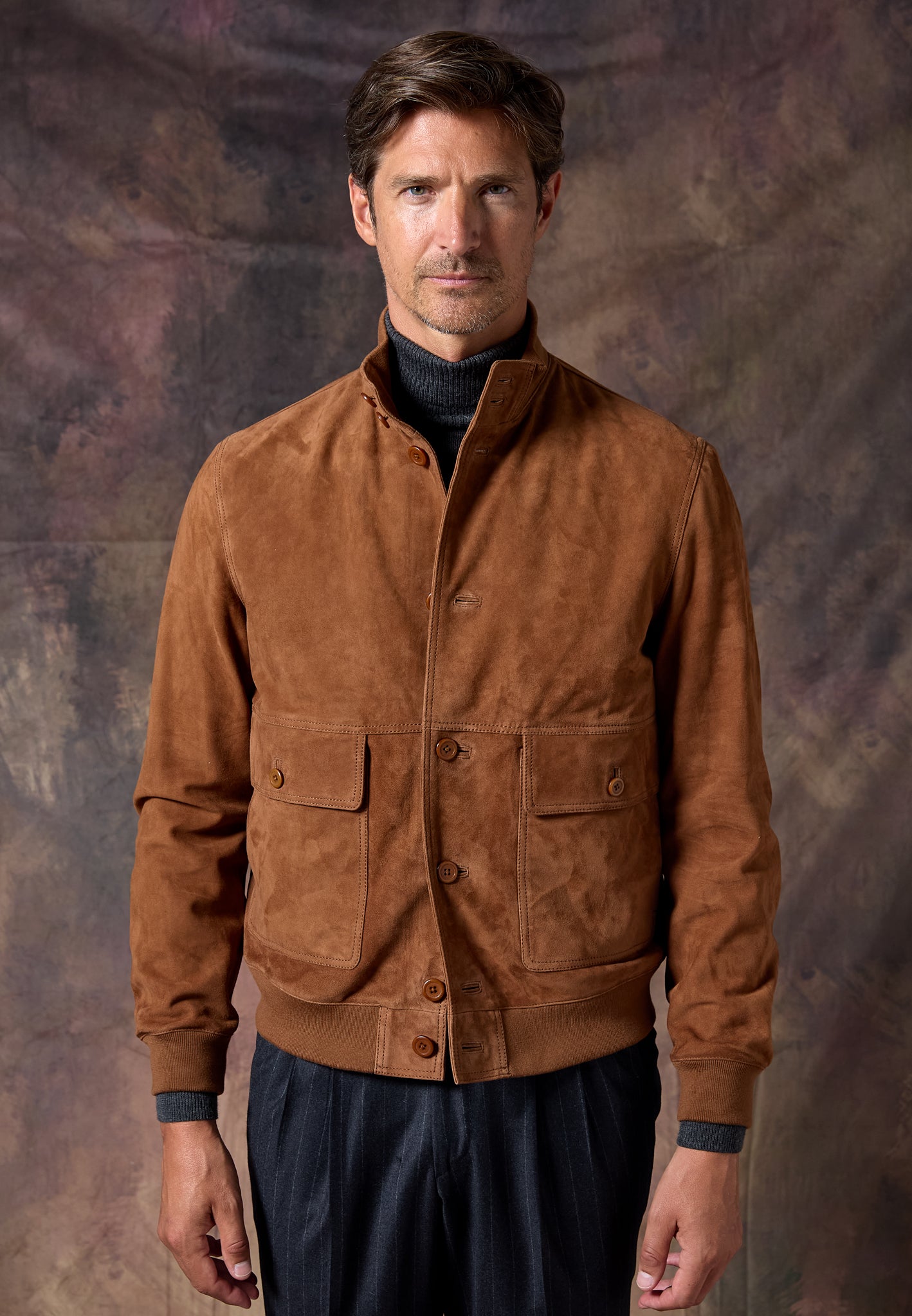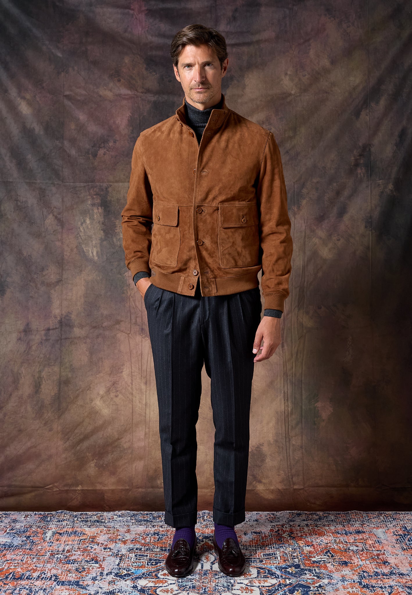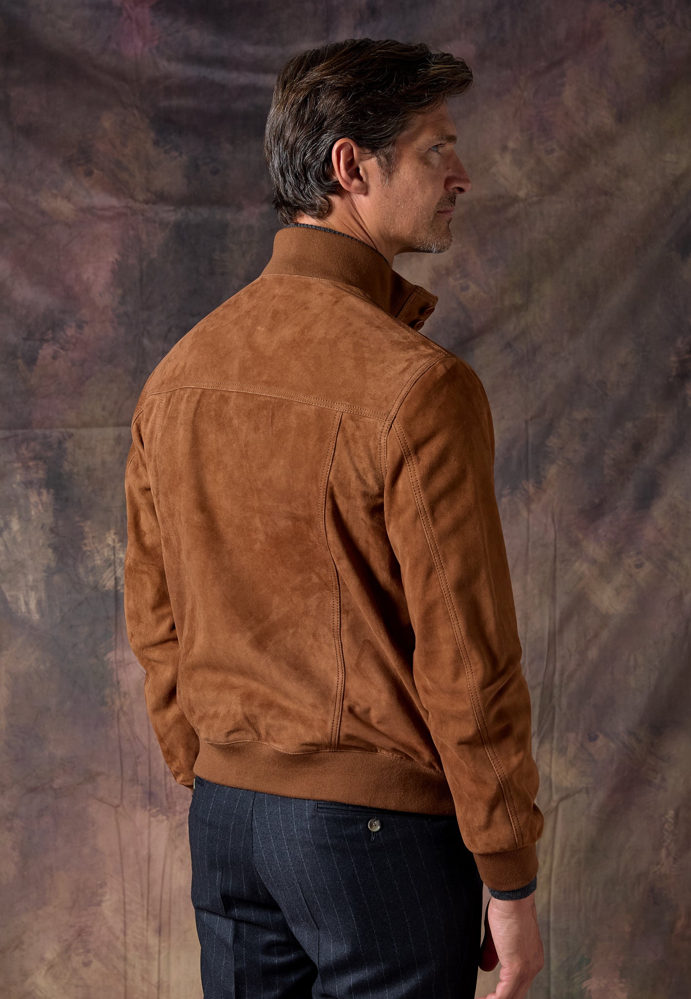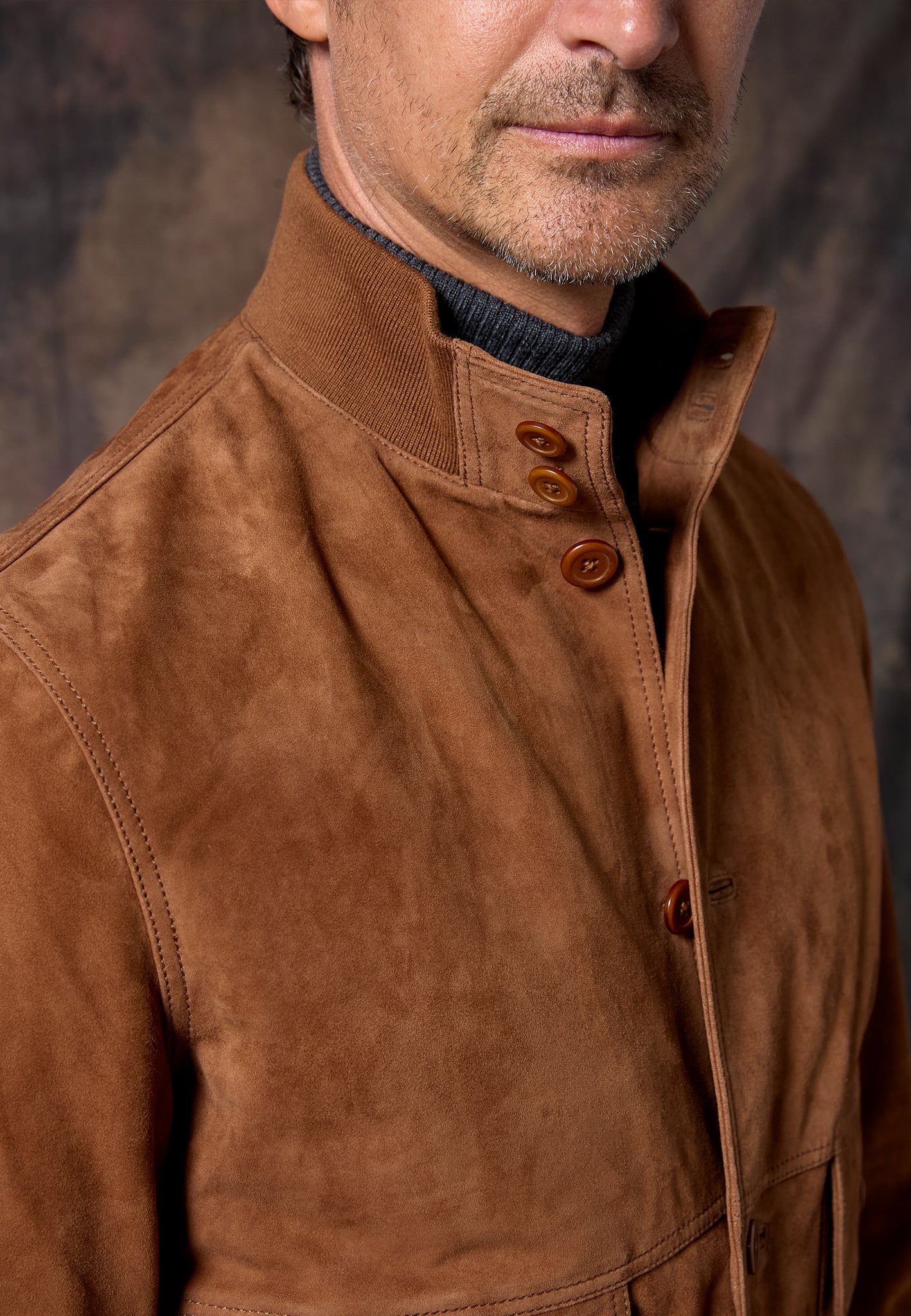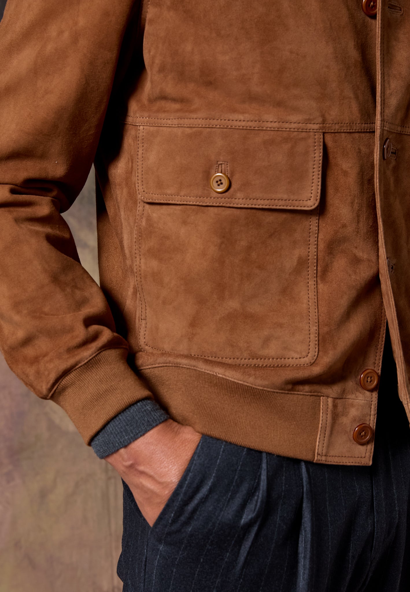 Una cazadora de ante en tono coñac, de textura suave y acabado aterciopelado. Su diseño clásico se combina con detalles modernos: bolsillo con solapa, costuras limpias y corte estructurado que estiliza la silueta. Versátil y atemporal, es una prenda que aporta sofisticación discreta tanto en un look casual con denim como en un conjunto más formal con pantalón de vestir.