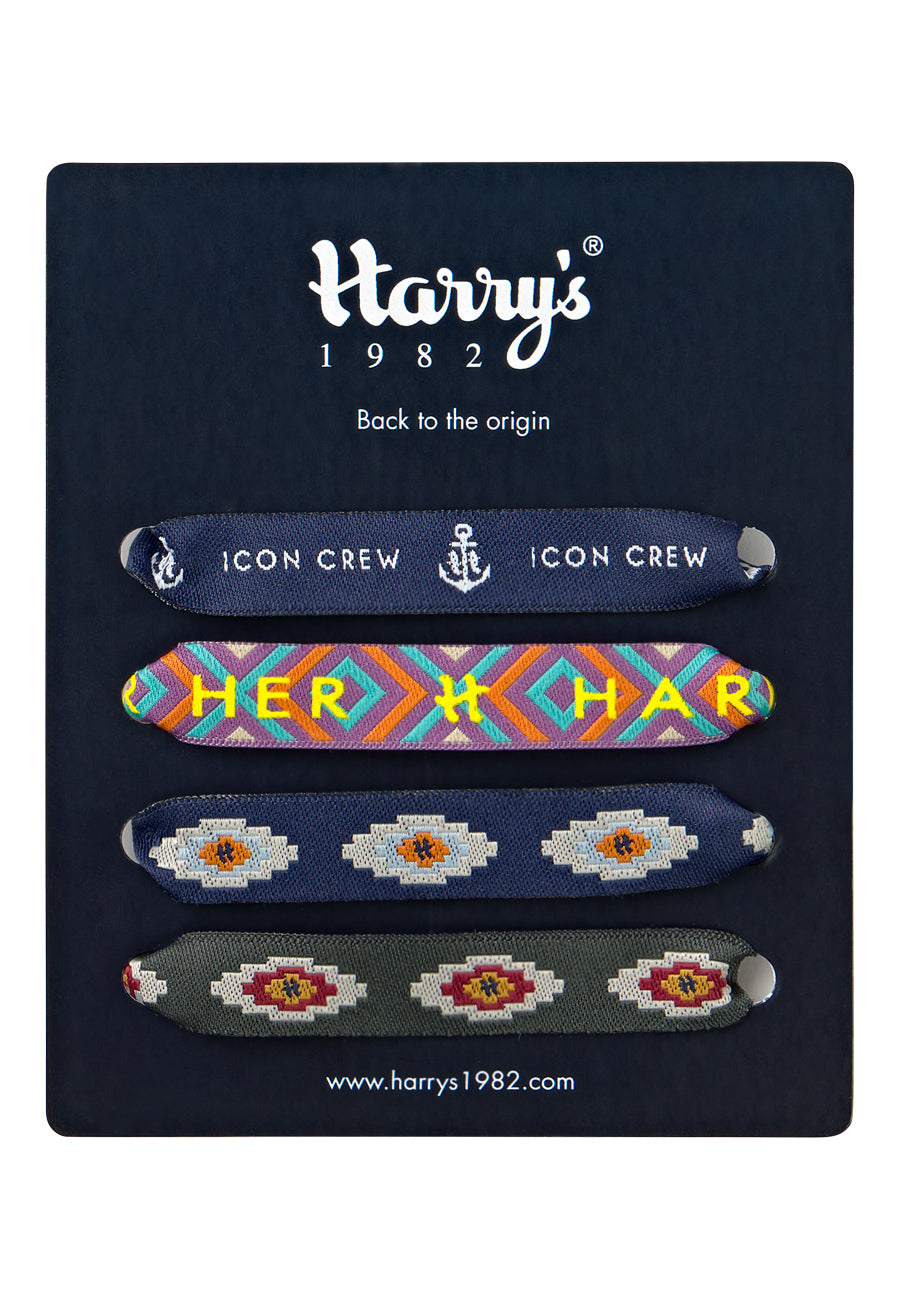 Pack de pulseras bordadas con los estampados propios de nuestra marca. La colección Origin de pulseras es el complemento perfecto para llevar a Harry's en cualquier momento y a cualquier lugar.