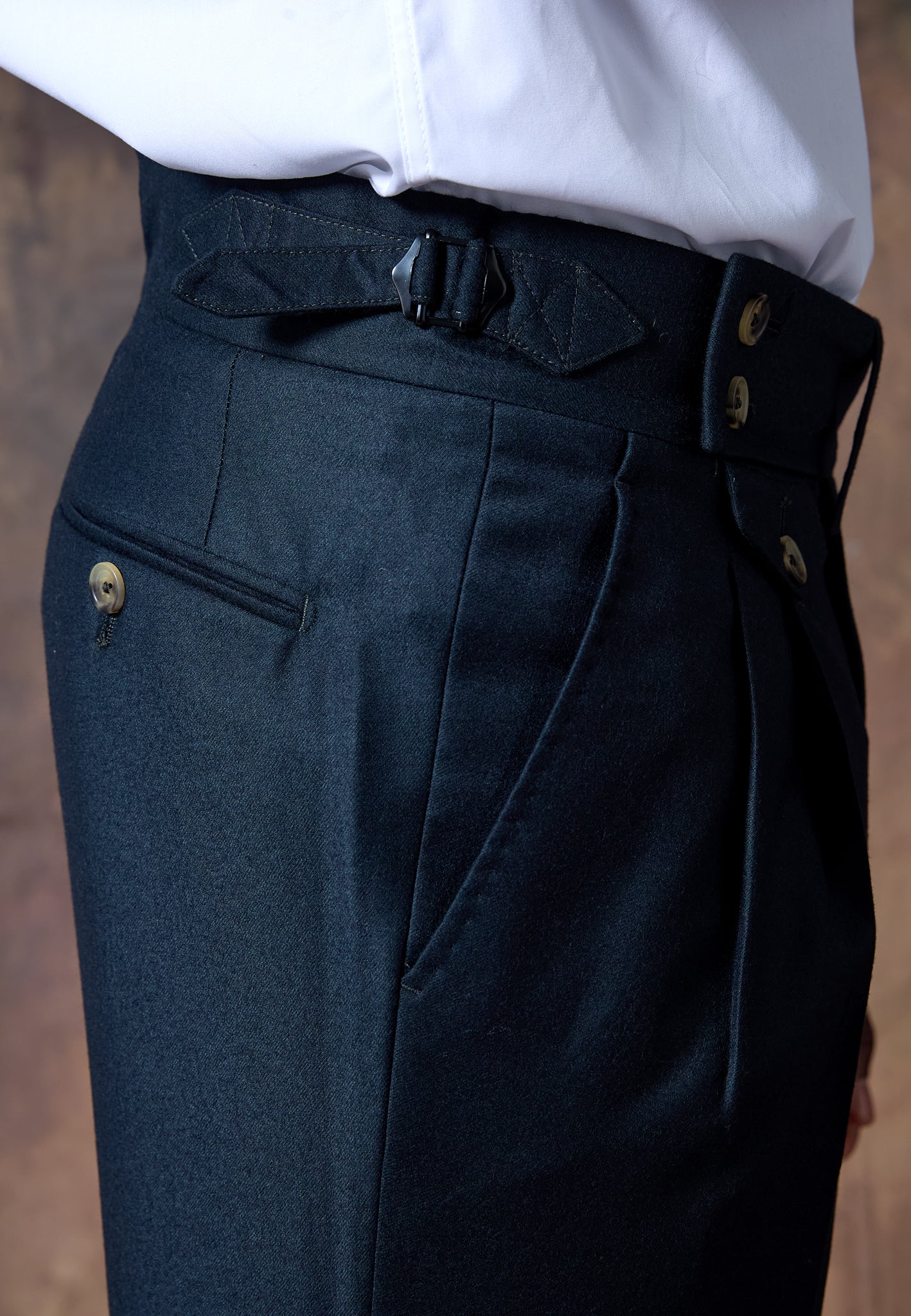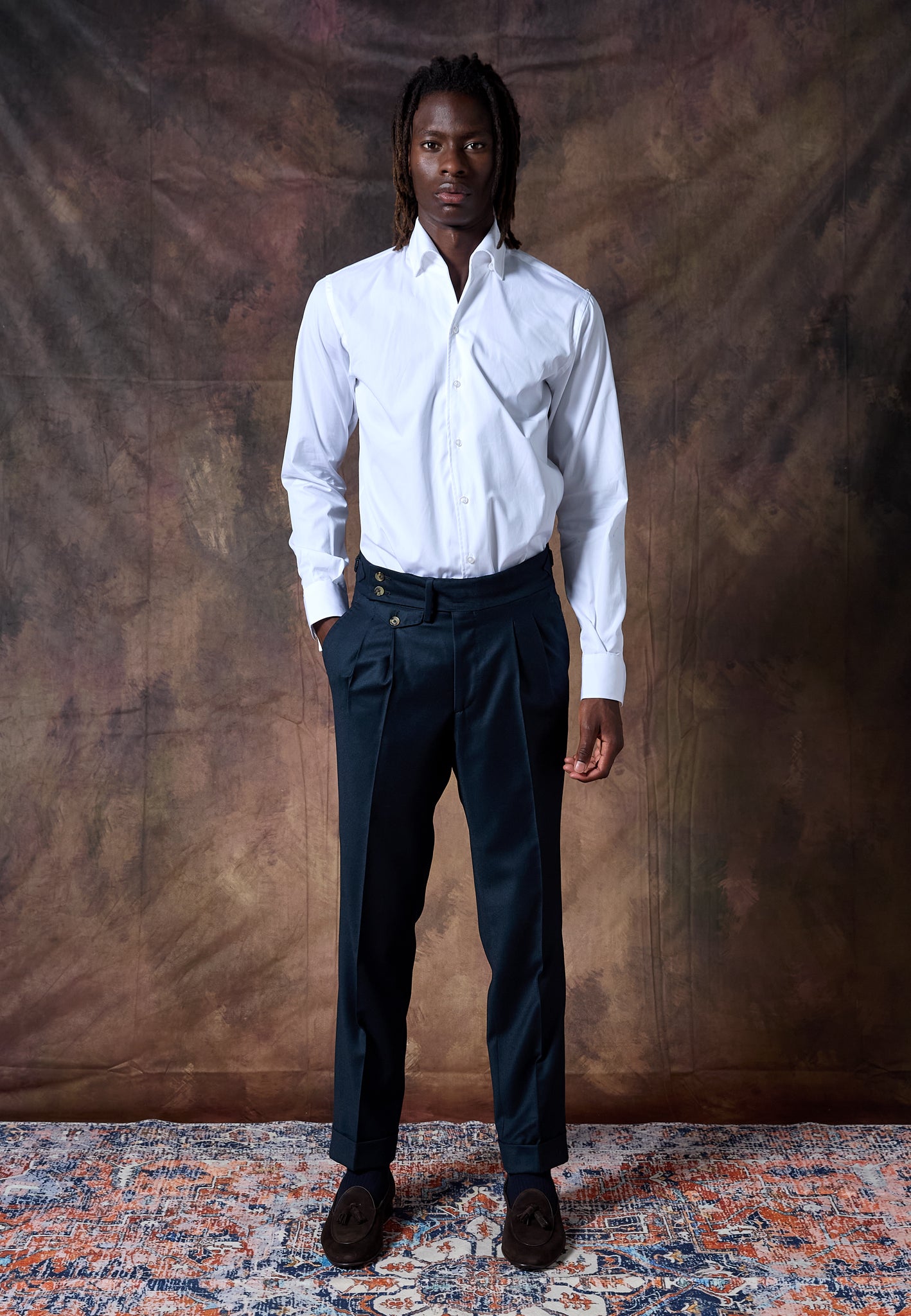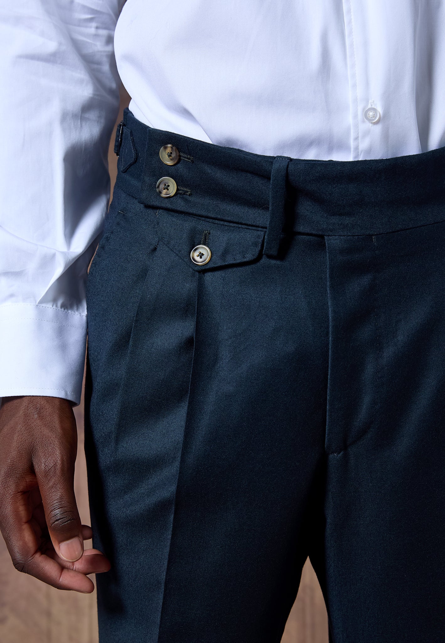 Confeccionado con lana italiana de la prestigiosa casa Marzotto, uno de los mejores lanificios del mundo, este pantalón ofrece una calidad insuperable y un estilo atemporal. Su diseño, con cierre de dos botones desplazados y ceñidores laterales, asegura un ajuste perfecto, mientras que la pinza doble añade un toque de sofisticación. Este pantalón es ideal tanto para ocasiones formales como para un look más relajado, adaptándose perfectamente a cualquier contexto.