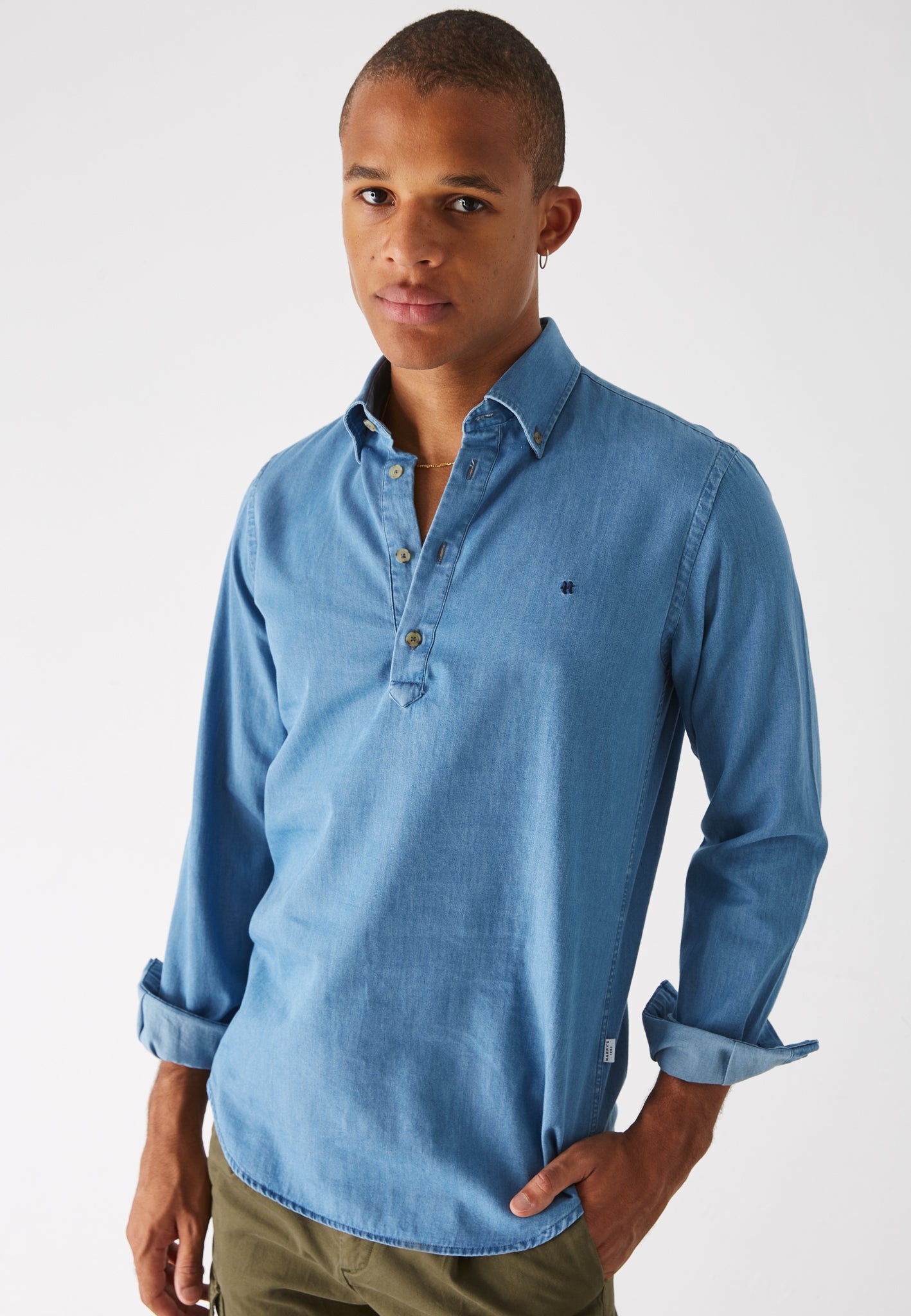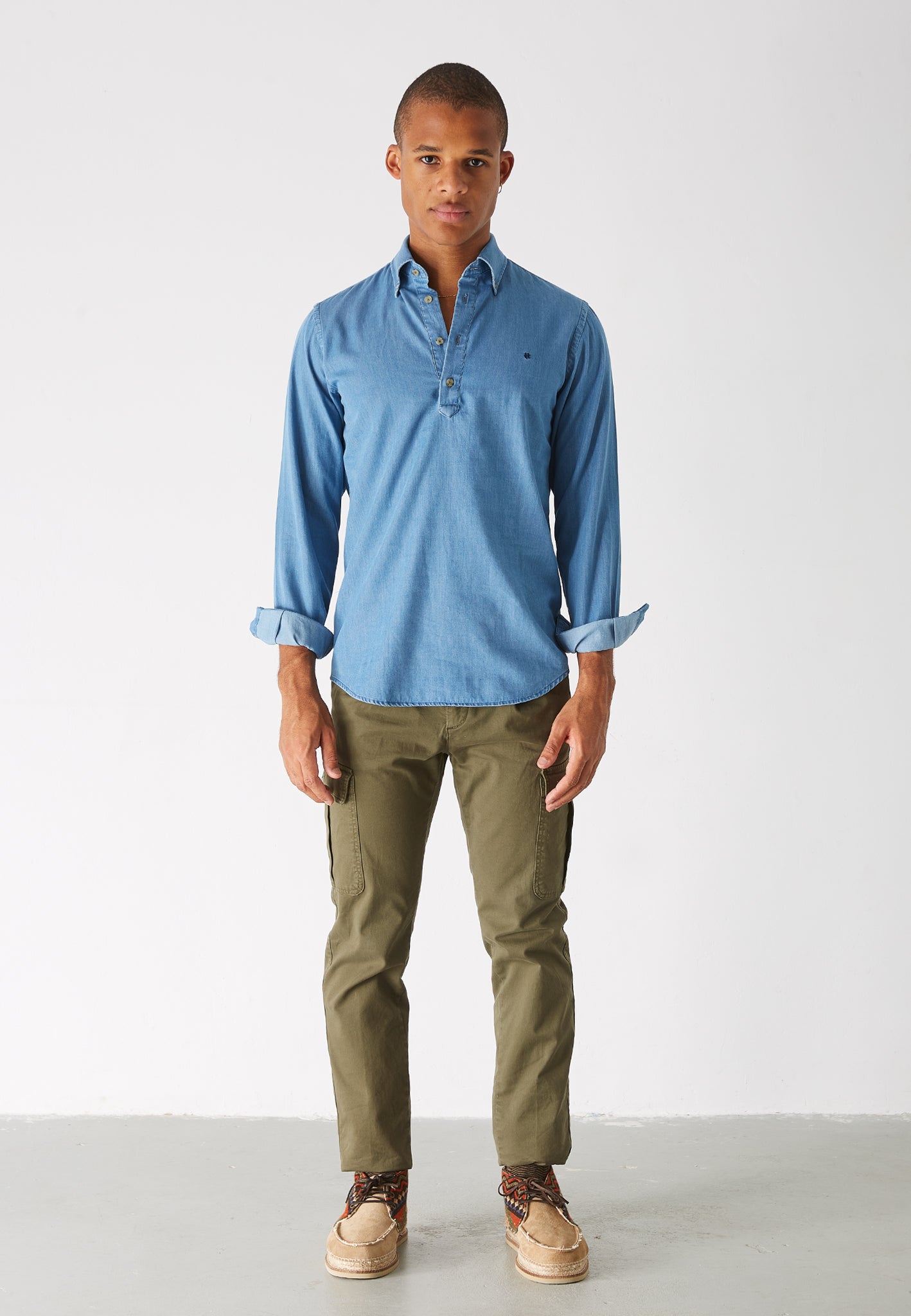 Su diseño permite que se luzca tanto bajo un jersey, ofreciendo la apariencia de una camisa tradicional, como sola en los días más cálidos, aportando un estilo desenfadado y fresco.