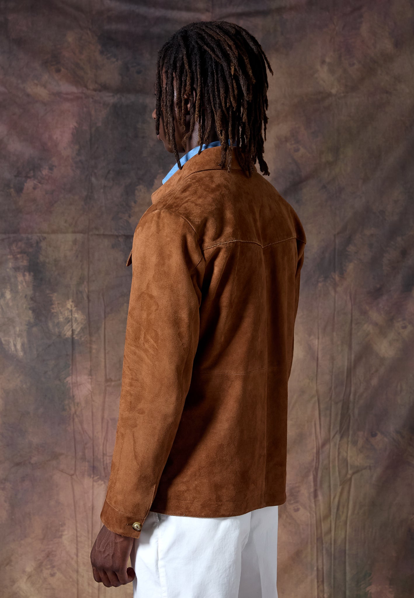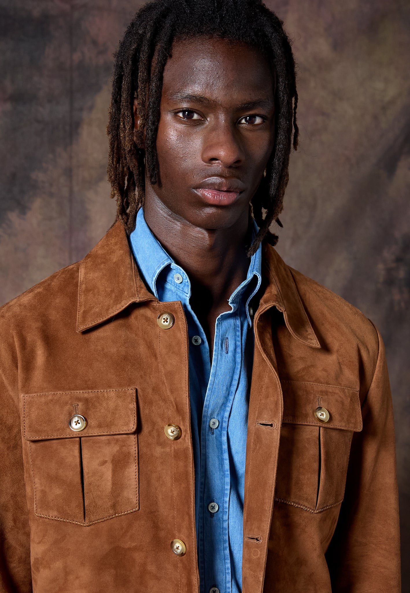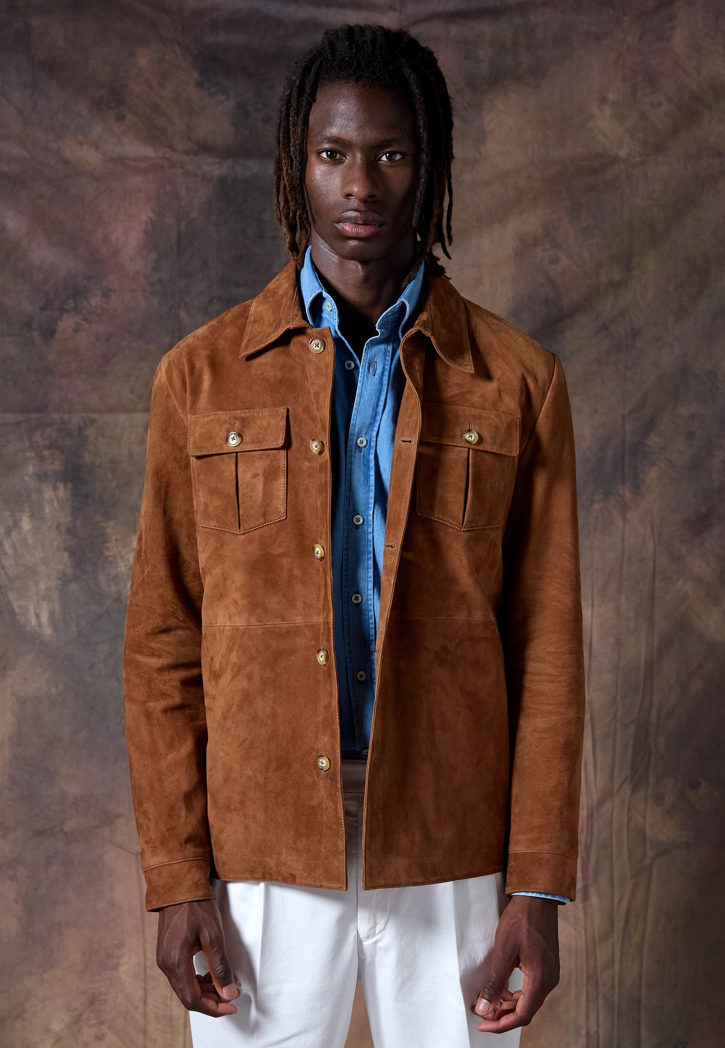 Confeccionada en suave piel caprina de acabado aterciopelado, esta sobrecamisa combina ligereza y sofisticación. Presenta cuello camisero, bolsillos superiores con tapeta y botón y un corte recto que aporta un estilo relajado pero refinado. Su diseño versátil permite llevarla como chaqueta ligera o como sobrecamisa en looks de entretiempo, convirtiéndola en una prenda atemporal y distinguida.