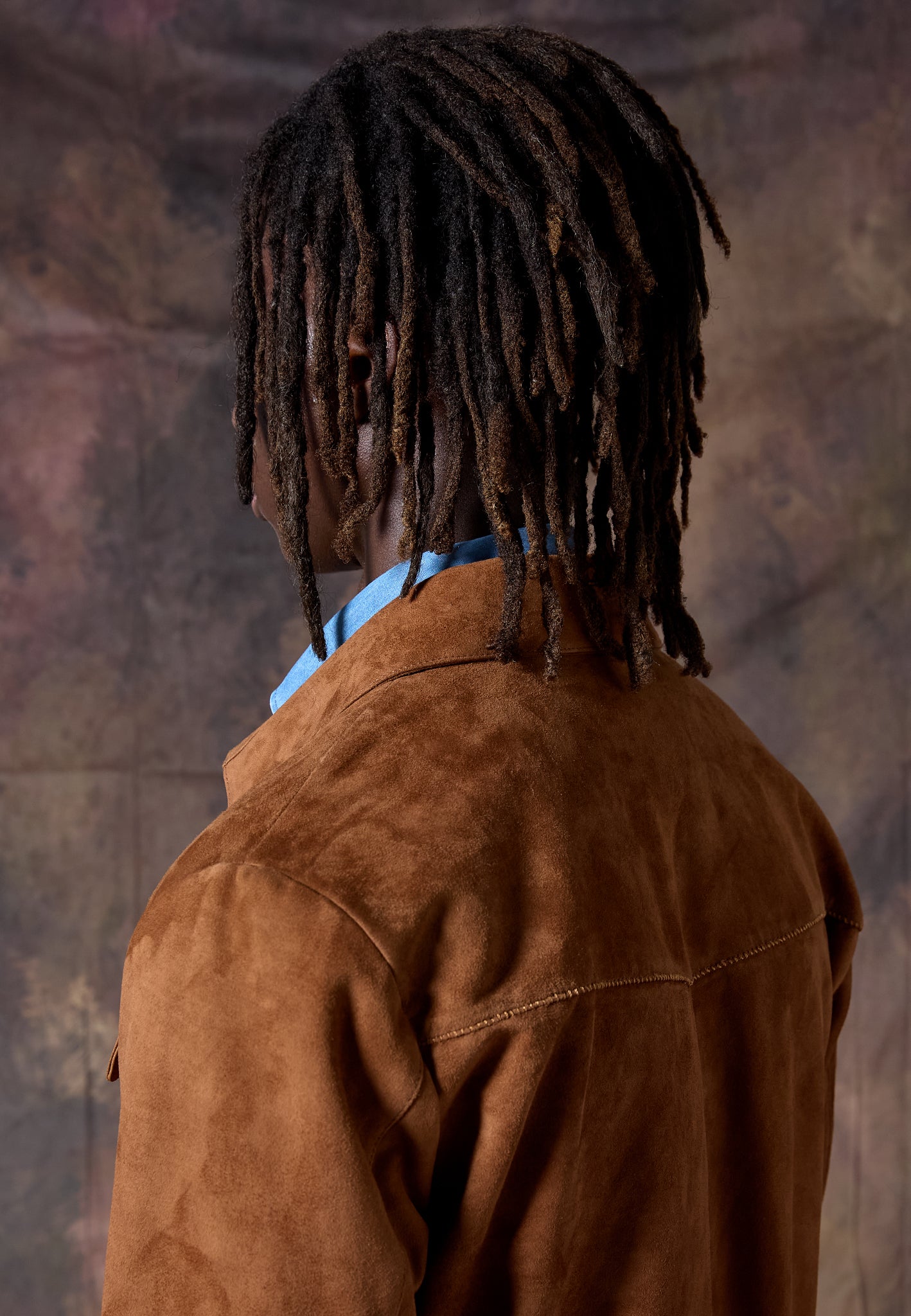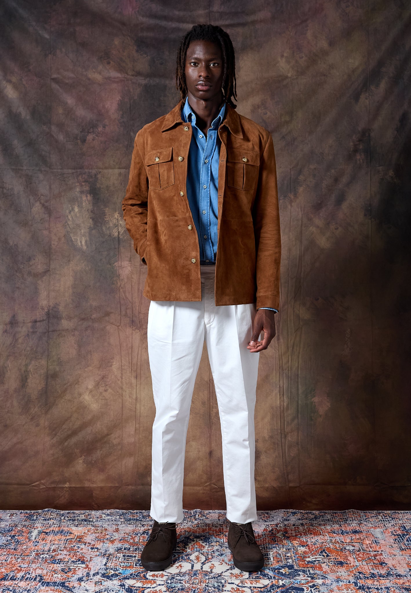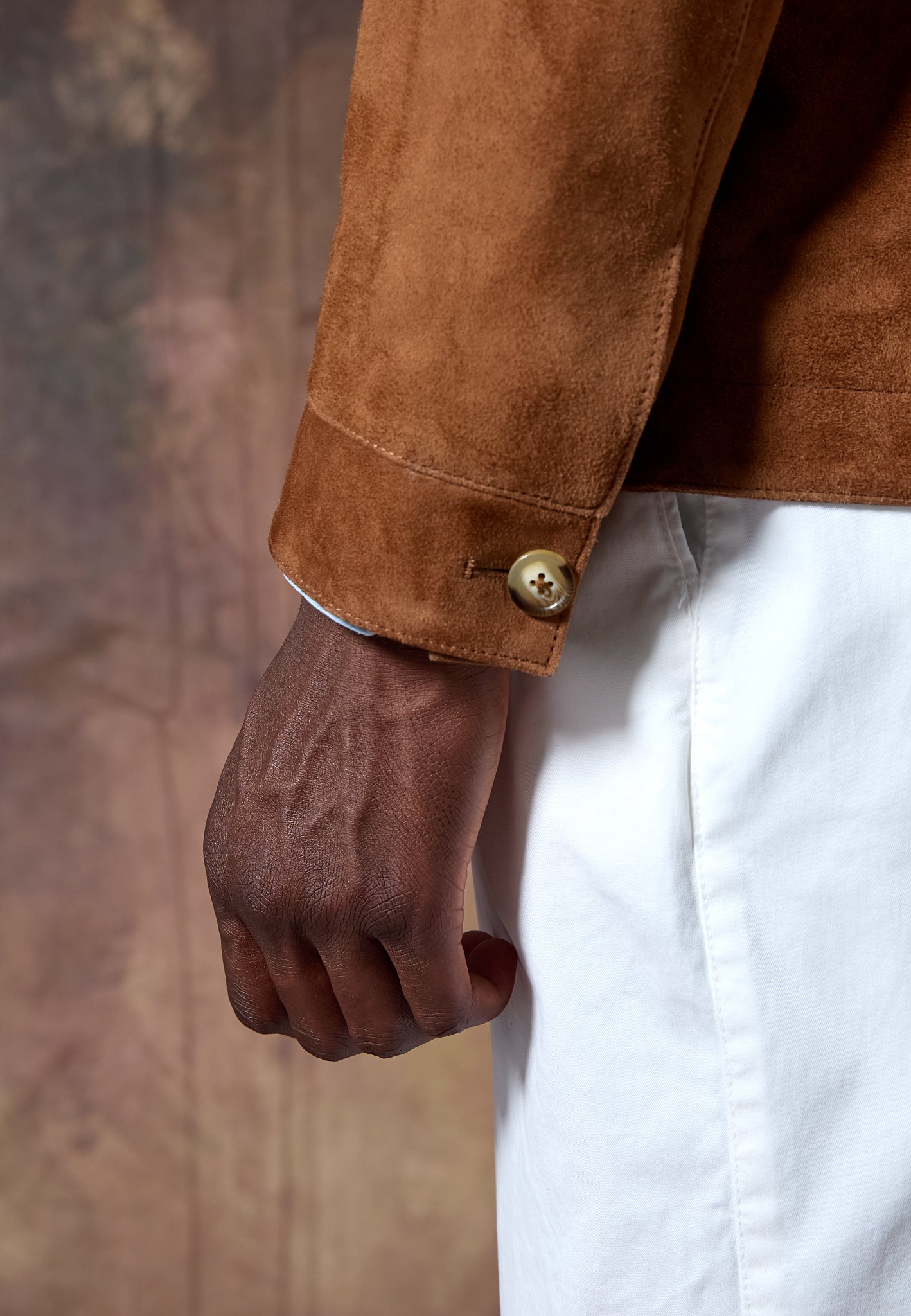 Confeccionada en suave piel caprina de acabado aterciopelado, esta sobrecamisa combina ligereza y sofisticación. Presenta cuello camisero, bolsillos superiores con tapeta y botón y un corte recto que aporta un estilo relajado pero refinado. Su diseño versátil permite llevarla como chaqueta ligera o como sobrecamisa en looks de entretiempo, convirtiéndola en una prenda atemporal y distinguida.