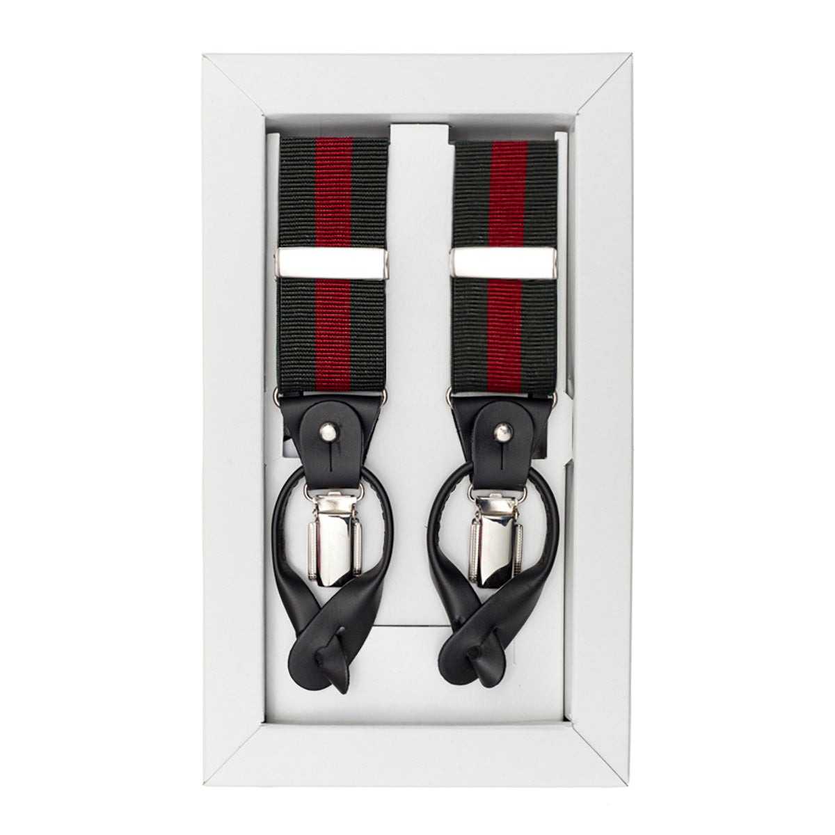 Tirantes elásticos y ajustables banda verde. Este tirante cuenta con detalles en piel vacuno marino con logo grabado a fuego. Incluye doble sujeción latiguillo y pinzas metálicas.